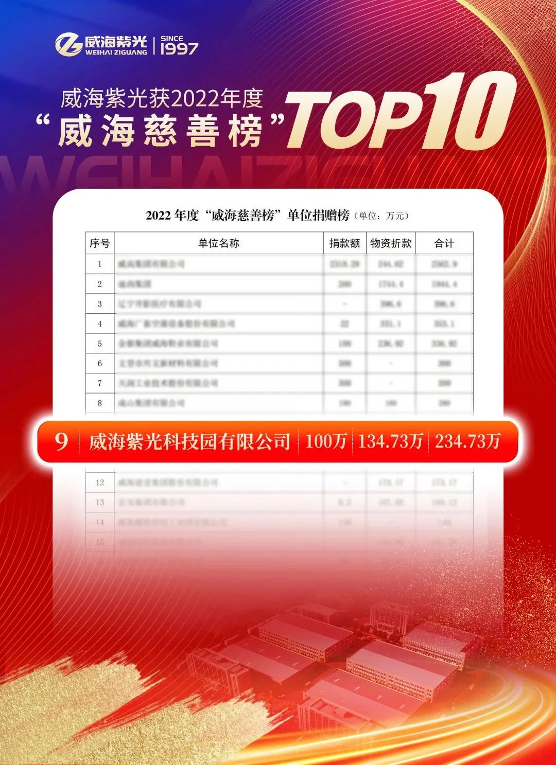 1月17日,2022年度“威海慈善榜”名单正式发布,威海紫光以234.73万元的捐赠总额入围威海慈善企业榜。